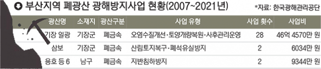 부산보건환경연구원에 따르면 경창광산은 1930년대부터 금·은·동 등을 채굴하다 1997년 폐광됐다. 이후 갱입구와 주변토양에선 납·아연·비소·카드뮴 등 중금속이 토양오염우려기준을 초과해 검출되고 있다. 지난해 말 조사에선 납 겁출량이 토양오염우려기준의 8배, 토양오염대책기준의 3배에 달했다.