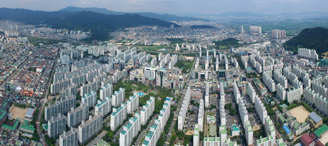 경남 김해지역 아파트 등 주택시장이 장기간 침체에서 벗어나 지난해 11월 이후 거래량이 부쩍 늘어나는 등 활기를 띠고 있다. 사진은 김해시가지 항공촬영 모습. 부산일보DB