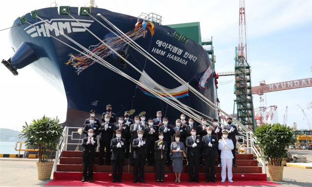 HMM(옛 현대상선)은 1만 6000TEU급 초대형 컨테이너 5호선 ‘HMM 한바다호’ 명명식을 13일 현대중공업 울산조선소에서 개최했다. 이날 행사에는 윤종원 기업은행장을 비롯해 정태순 한국해운협회장, 배재훈 HMM 사장, 한영석 현대중공업 사장 등이 참석했다. HMM 제공