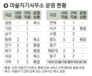 마을지기사무소의 축소나 폐지는 앞으로 더 가속화할 전망이다. 부산 동구만 하더라도 현재 운영 중인 5개 마을지기사무소 중 2개가 오는 8월 1일 폐쇄될 예정이다. 동구청 도시전략재생과 관계자는 “시비 지원이 종료된 2곳에 대해 구비 확보가 쉽지 않아 폐쇄를 결정하게 됐다”며 “5곳 모두 시비 지원이 종료되면 단계적으로 폐쇄한 후 사무소 하나만 남겨 동구 전 지역을 관리할 계획이다”고 말했다.