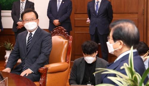 김 총리는 17일 국회를 찾아 박병석 국회의장, 정의당 여영국 대표, 국민의당 안철수 대표, 더불어민주당 송영길 대표, 국민의힘 김기현 원내대표 등 국회 및 정당 지도자들을 차례로 만났다. 박 의장은 “중요한 법안이나 정책은 사전에 국회와 충분히 협의하고 야당에도 잘 설명했으면 좋겠다”고 김 총리에게 당부했다. 김 총리는 “어려움 속에서도 잘 조정해주셔서 (총리 인준안의) 국회 동의를 받게 된 것에 감사드린다”며 “여야를 가리지 않고 정부 정책을 설득하는 노력을 하겠다”고 답했다.