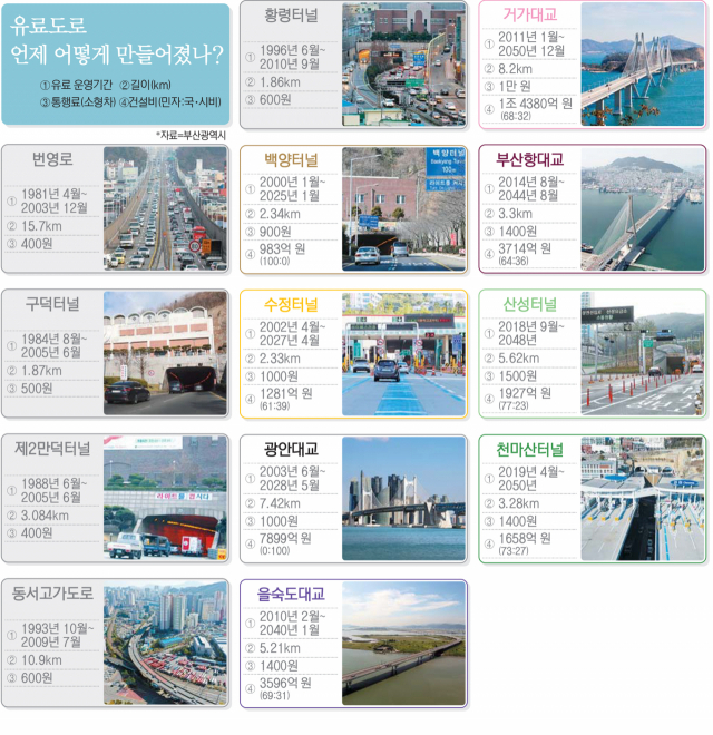 부산 유료도로 역사는 40년 전으로 거슬러 올라간다. 부산 구서IC에서 출발해 동구 좌천동 충장고가로에서 끝나는 번영로(15.7km, 소형차 기준 400원)가 시작이다. 이후 2019년 천마산터널이 개통하기까지 모두 13개의 유료도로가 생겼다. 2000년대 이후엔 광안대교가 국비 7899억 원으로 건설된 것을 제외하곤 백양터널(983억 원)을 시작으로 무려 7개 유료도로가 민간자본의 손에 지어졌다.