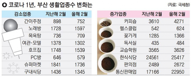 코로나19 발생 1년 만에 부산에서 간이주점 노래방 목욕탕 호프집 모텔 PC방 등이 크게 줄어든 것으로 나타났다. 반면 커피숍과 헬스클럽, 교습소·공부방 등은 많이 늘어났다. 코로나로 직접 타격을 받은 업종이 많이 줄었지만 자영업자가 1년간 크게 늘면서 불황이 예상되는 가운데서도 일부 업종의 창업이 많았던 것으로 분석된다.