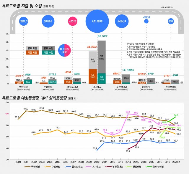 2020년까지 수정터널, 백양터널을 제외한 5개 유료도로는 적자를 봤다. 하지만 향후 운영을 지속할 경우 대부분의 유료도로가 큰 폭의 흑자 전환을 통해 건설비 수 배에 달하는 돈을 벌어들일 것으로 분석됐다.