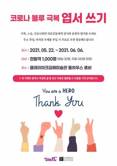 (재)김해문화재단 클레이아크김해미술관(관장 안규식)은 오는 5월 22일(토)부터 6월 6일(일)까지 <코로나 블루 극복 엽서쓰기> 이벤트를 개최한다고 밝혔다.
