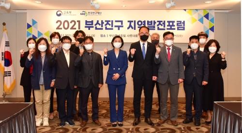 동의대학교 LINC+사업단(단장 이임건)과 부산진구(구청장 서은숙·가운데)는 지난 21일 부산롯데호텔에서 ‘2021 부산진구 지역발전포럼’을 개최했다. 이날 행사에는 한수환 동의대 총장과 이임건 단장, 서은숙 구청장, 지역발전포럼 위원들이 참석했다. 김민우(동의대 디자인조형학과) 교수는 ‘지역의 공공문제 해결을 위한 디자인 참여 프로그램’을 주제로 특강을 진행했다. 이재희기자