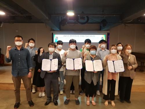 부산 남구청년발전소 입주 기업 관계자들이 각종 공모에 선정된 것을 기념해 포즈를 취했다.