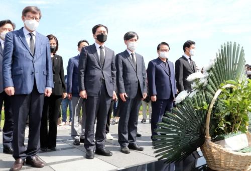 박형준(앞줄 맨 왼쪽) 부산시장과 국민의힘 김기현(앞줄 왼쪽 두 번째) 대표 권한대행 겸 원내대표 등이 23일 부산 남구 유엔기념공원을 찾아 참배하고 있다. 강원태 기자 wkang@노무현 전 대통령의 12주기 추도식 참석 차 경남을 찾은 김부겸 국무총리가 추도식을 마치고 부산에서 박형준 부산시장, 송철호 울산시장, 김경수 경남지사를 만나 부산·울산·경남 메가시티 구축 등 지역 현안에 대한 정부 차원의 지원을 재약속했다.