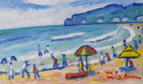 김영주 ‘송정해수욕장’(2020). 미광화랑 제공어울림 3인전=29일까지 예전원. 김수정, 백경원, 임봉규 세 작가가 보자기와 회화를 접목한 작품, 정물화, 수채 작업을 선보인다.