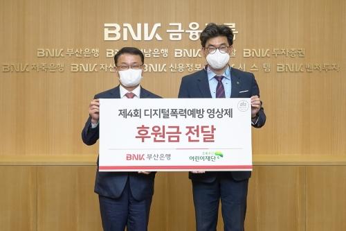 BNK부산은행(은행장 안감찬)은 25일 본점에서 초록우산어린이재단 부산지역본부(본부장 노희헌)에 학교폭력 예방을 위한 후원금 3000만 원을 전달했다. 이날 후원금은 ‘제4회 디지털 폭력 예방 영상제’ 사업에 쓰인다.