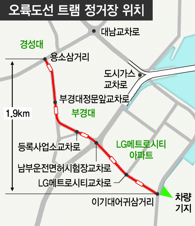 부산시와 한국철도기술연구원은 25일 오후 부산 남구청 1층 대강당에서 '오륙도선(실증 노선) 교통처리계획(안) 주민설명회'를 열고 저상트램 조성에 따른 교통 계획(이하 계획안)을 처음으로 공개했다. 해당 안에 따르면 도시철도 경성대부경대역~이기대어귀 삼거리 간 총 1.9km에 달하는 저상트램 노선에 5곳의 정거장이 세워진다. 정거장 위치는 경성대부경대역 인근 1곳, 부경대 대연캠퍼스 정문 인근 1곳, 도로교통공단 앞 1곳, 남부운전면허 시험장 앞 1곳, 용문중학교 앞 1곳 등이다. 정거장 명은 이후 역명심의위원회를 통해 정한다.