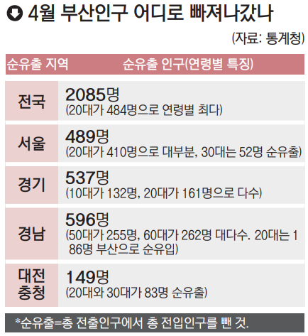 4월 순유출 인구를 구체적으로 살펴보면 부산→서울로 간 순유출 인구가 489명이었고 경기도로 537명, 경남으로 596명이 빠져나갔다. 인천으로는 42명이 순유출됐다.