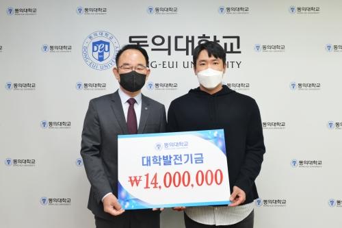 롯데자이언츠 전준우(오른쪽) 선수는 27일 동의대학교(총장 한수환·왼쪽)에 1400만 원 상당의 야구배트 100개를 전달했다.