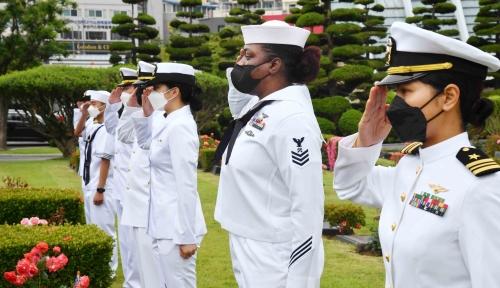 주한미해군사령부와 해군작전사령부 장병들이 미국의 현충일인 ‘메모리얼 데이’를 앞두고 27일 오전 부산 유엔기념공원을 찾아 6·25 전쟁 당시 전사한 참전 용사의 희생정신을 추모하는 의식을 갖고 있다. 정종회 기자 jjh@