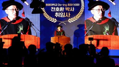 27일 오후 동명대 중앙도서관 대회의실에서 열린 동명대 10대 총장 전호환 박사 취임식에서 전 총장이 취임사를 하고 있다. 정종회 기자
