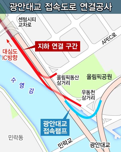 광안대교 접속도로는 벡스코 요금소~센텀시티 지하차도를 연결하는 276m 길이의 연결도로다. 대심도가 센텀시티 지하차도와 연결되므로, 접속도로는 사실상 광안대교와 대심도를 곧바로 잇는 역할을 한다. 해운대 신도시와 마린시티, 기장군에서 발생하는 교통량이 유입할 수 있어 운영사 입장에서는 접속도로 개통이 운영 수입에 큰 영향을 미친다.