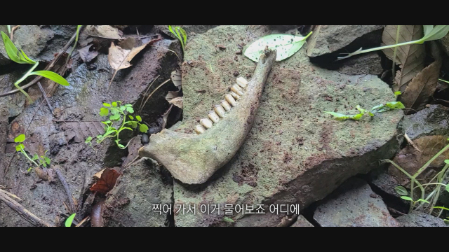 그리고 우리는 동굴 입구에서 의문의 '뼈 조각'을 발견했습니다. 여러 개의 이빨이 붙어 있는 턱 뼈. 전문가에게 문의한 결과 소름 돋는 '이것'은 흑염소 뼈였습니다. 실제 산 곳곳에 염소 배설물이 많았고, 철수 도중 떼지어 다니는 염소를 목격하기도 했습니다.