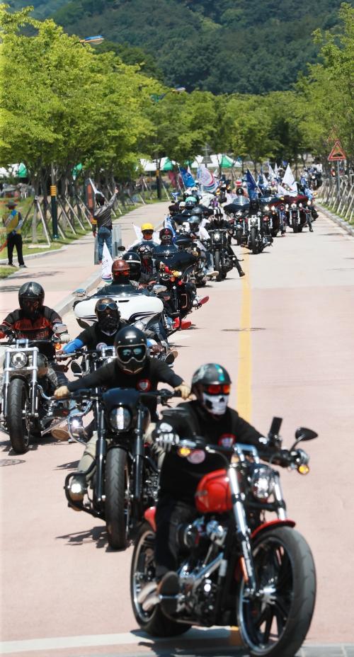 2021 함양산삼항노화엑스포 개막을 100일 앞둔 지난 29일 경남 함양군 고운광장 일대에서 모터사이클 동호인들이 엑스포 홍보 퍼레이드를 벌였다. 함양산삼항노화엑스포는 9월 10일부터 10월 10일까지 상림공원과 대봉산휴양밸리에서 개최된다. 함양군 제공