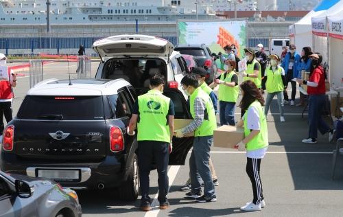부산지역 공공기관과 세이브칠드런이 함께하는 드라이브스루 형식 농수산물 판매 자선행사 ‘다함께 차차차 시즌2’가 29일 부산항국제여객터미널 야외주차장에서 열렸다. 이번 행사는 차를 타고 채소, 과일 등을 살 수 있는 행사로 수익금은 지역 저소득층 자녀를 위해 사용된다. 정대현 기자 jhyun@