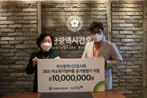 부산광역시간호사회(회장 황지원·왼쪽)는 최근 제50회 국제간호사회의 날을 맞아 ‘건강한 숨쉬기-숨’ 지원금 1000만 원을 초록우산 어린이재단(부산지역본부장 노희헌·오른쪽)에 전달했다.