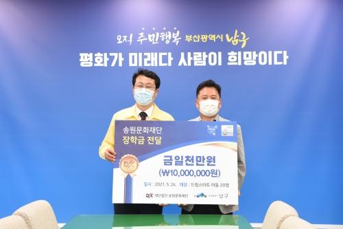 송원문화재단(이사장 장세욱)은 최근 부산 남구 드림스타트에 송원장학금 1000만 원을 전달했다. 박재범(왼쪽) 남구청장은 “아동들을 위한 장학금을 전달해 준 데 대해 감사하다”고 밝혔다. 송원문화재단 정목용(오른쪽) 사무국장도 “남구의 발전에 일익을 담당할 수 있는 후원을 이어가겠다”고 약속했다. 임원철 선임기자