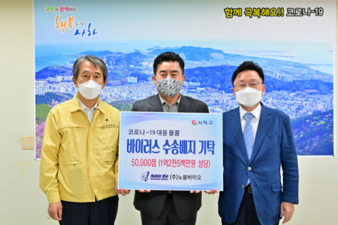㈜노블바이오(대표 백계승)는 코로나19 대응 물품으로 바이러스 수송배지 50,000점(1억2,500만 원 상당)을 5월 28일 사하구(구청장 김태석)에 전달했다. 기탁된 바이러스 수송배지는 사하구 선별진료소에서 코로나19 검사에 사용될 예정이다.