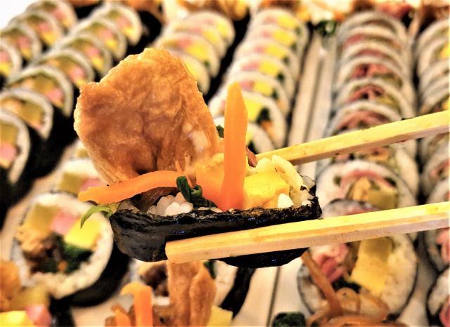 기본은 쌤김밥이다. 여기에는 햄, 단무지, 계란, 유부, 당근, 우엉, 시금치 등 일곱 가지 지단을 넣는다. 우엉은 간장과 물엿을 넣어 두 시간 졸여 만든다.