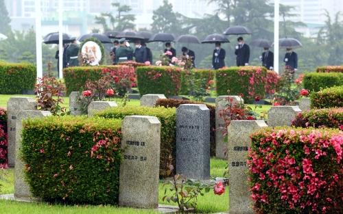 현충일을 앞둔 3일 비 오는 날씨에도 세계에서 유일한 유엔기념묘지인 부산 남구 유엔기념공원에 전몰장병을 기리는 이들의 발길이 이어졌다. 유엔기념공원에는 한국전쟁 당시 전사한 한국군 36명을 포함해 호주, 캐나다, 영국, 터키 등 11개국 2311명이 안장돼 있다. 정종회 기자 jjh@