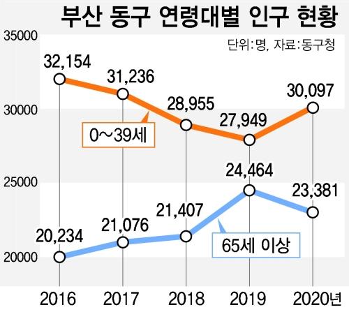 3일 부산 동구청에 따르면 2020년 인구통계 조사 결과 0~39세 인구는 2019년보다 2148명 늘어난 것으로 나타났다. 반면 65세 인구는 1083명 줄었다. 부산 16개 구·군 중 노령화 지수가 가장 높은 동구로서는 이례적인 변화다. 동구는 2016년부터 2019년까지 4년 연속으로 65세 노령층은 늘어난 반면, 39세 이하 인구는 꾸준히 감소했다.