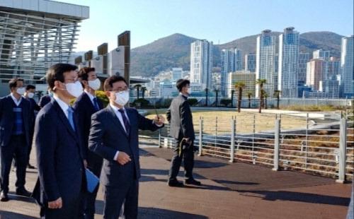 지난해 11월 부산 북항재개발홍보관을 찾은 문성혁(앞줄 왼쪽) 해수부 장관. 부산일보DB부산항 북항 재개발 사업과 관련한 감사를 둘러싼 해양수산부 내 갈등이 담당자들의 인사 조치로 일단락됐다. 해수부가 이달 내 감사 결과를 발표하겠다고 밝힌 가운데 부처 내 이견과 갈등을 딛고 향후 사업 진행이 차질 없이 이뤄질지에 이목이 집중된다.