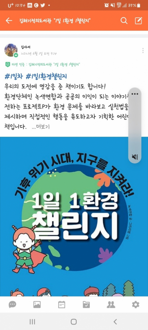 도서관에서 만든 네이버 밴드 ‘지구를 구해줘’에 가입한 20팀의 가족들이 ▲장바구니 휴대하기 ▲카페에서 텀블러로 테이크 아웃하기 ▲걷거나 대중교통 이용하기 ▲엘리베이터 대신 계단 사용하기 ▲작아진 옷 나누기 ▲안 쓰는 플러그 빼두기 ▲건조기 대신 자연광에 빨래 말리기 ▲쓰지 않는 빨대 모으기 ▲이면지 연습장 쓰기 ▲재활용품을 활용한 장난감 만들기 ▲아이들과 함께하는 주말 플로깅(조깅하면서 쓰레기 줍기) ▲화분에 모종 심기 등 매일 환경을 위해 한 실천 내용을 사진과 짧은 글 쓰기로 인증하며 참여하고 있다.