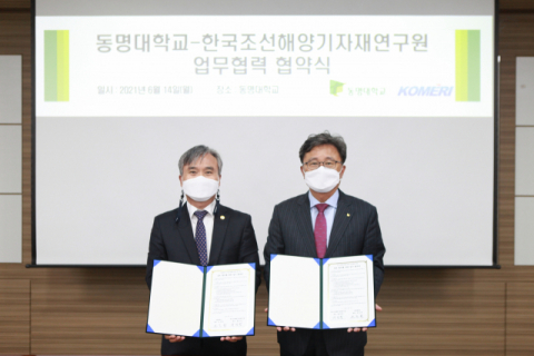 동명대(총장 전호환)와 한국조선해양기자재연구원(원장 배정철, 이하 KOMERI)은 ‘인재양성 및 연구 수행에 있어 상호 밀접한 교류와 협력을 위한 업무협약식’을 지난 6월 14일 동명대에서 가졌다. 동명대 전호환 총장, KOMERI 배정철 원장 외 관계자 7명이 참석했다.