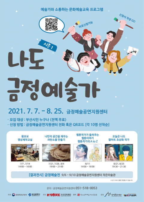 (재)금정문화재단(이사장 정미영)은 2021 문화예술교육프로그램 ‘나도 금정예술가’ 수강생을 오는 21일부터 선착순 모집한다.