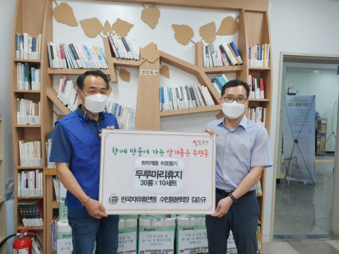 부산 동래구 수민동(동장 이종국)은 지난 15일 한국자유총연맹 수민동분회 김순규 분회장으로부터 코로나19 극복 및 어려운 이웃을 위해 두루마리휴지(30개입) 10세트(환가액 20만 원 상당)을 지원받아 관내 취약계층 10세대에 전달했다고 밝혔다.