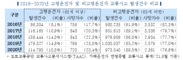 교통사고 사망자 중 가해자가 고령 운전자인 경우(23.4%) 역시 2016년(17.7%) 대비 늘어났다.