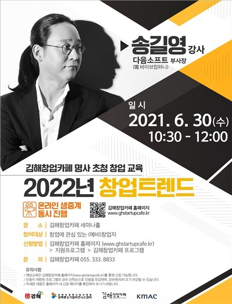 김해시·김해의생명산업진흥원(원장 윤정원, 이하 진흥원)에서 운영하고 있는 김해창업카페에서 오는 30일 송길영 부사장(現바이브컴퍼니)을 초청하여 '2022년 창업트렌드'주제로 강연회를 개최한다.