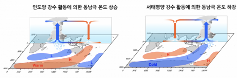 이러한 비대칭적 지표 기온 변화의 새로운 원인이 밝혀졌다. 기초과학연구원(IBS, 원장 노도영) 기후물리 연구단(단장 악셀 팀머만) 이준이 연구위원(부산대 기후과학연구소 교수) 연구팀은 국제공동연구를 통해 열대 서태평양 지역 강수활동이 증가하면, 동남극 지역 지표 기온이 하강한다는 사실을 규명했다.