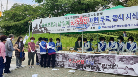 부산 동래구(구청장 김우룡)는 지난 22일 한국자유총연맹 동래구지회(지회장 유명진) 주관으로 온천천 인공폭포 앞에서 지역 주민 등을 대상으로 보리주먹밥, 보리개떡, 삶은 감자 등 500인분을 시식 체험하는 '전시비상식량 시식회' 를 개최했다고 밝혔다.이날 행사는 6월 호국보훈의 달을 맞아 한국전쟁 당시 주로 먹었던 전시식량을 맛보며, 국가 안보의 중요성과 자유의 소중함을 상기시키고자 하는 취지에서 마련되었다. 사전에 음식은 개별 포장하여 시식을 희망하는 주민들에게 배부하여 따로 취식하게 하는 등 사회적 거리두기를 준수하며 진행되었다.