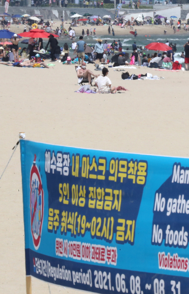 코로나19 여파로 올해 해수욕장 방역은 더 강화됐다. 해운대·송정해수욕장은 이달 1~4일은 4인 이하, 5일부터는 8인 이하로 집합을 제한한다. 7월 4일 미국 독립기념일이 포함된 이번 주말까지 미군 등이 단체로 방문해 난동을 부릴 수 있다는 우려가 나오기 때문이다. 나머지 5개 해수욕장은 1일부터 8인 이하 집합이 적용된다. 부산 7개 해수욕장 8인 이하 집합 제한은 우선 이달 14일까지 유지되며 백신을 접종받은 사람은 제한 인원에 포함되지 않는다.