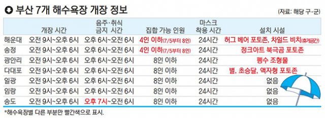 이들 해수욕장에선 전자출입명부나 안심콜을 활용해 방문 이력을 기록하고, 파라솔 대여나 샤워장 사용 때 체온 확인도 진행한다. 해운대·송정해수욕장 방문객에게는 ‘체온 스티커’를 배부해 발열 여부도 관리할 계획이다. 임랑·일광해수욕장은 올해 텐트와 그늘막 설치를 전면 금지하고, 이벤트 무대와 음수대를 운영하지 않는다.