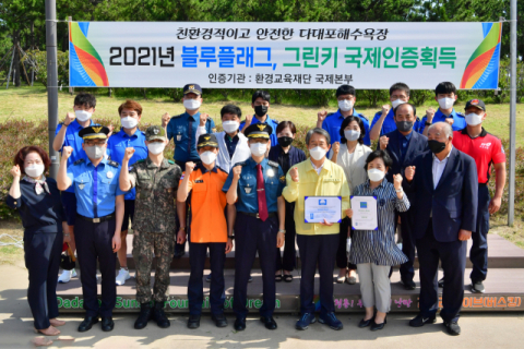 부산시 사하구(구청장 김태석) 다대포해수욕장이 ‘블루플래그(Blue Flag) 국제인증’을, 다대포 해변공원이 ‘그린키(Green Key) 국제인증’을 세계 최초로 동시에 획득했다. 사하구는 7월 1일 다대포해수욕장 개장일에 맞춰 깃발 게양식과 2021년 친환경 해수욕장 운영을 위한 선포식을 개최했다.
