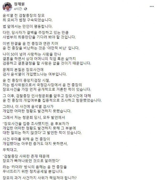 그러면서 장 의원은 "장모의 과거 사건까지 사위가 책임져야 하냐"는 말로 글을 마무리했다.