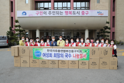 부산 자유총연맹중구협의회여성회(회장 정주윤)는 지난 2일, 구청 광장에서 관내 어르신 및 공동생활가정 200세대 대상으로 전달될 「희망의 국수 나눔」전달식을 진행했다.