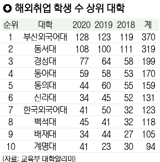 해외 취업에 대한 청년들의 열망은 부산이 유독 높다. 교육부의 ‘졸업생 취업현황’ 공시자료를 보면 2018년부터 지난해 전국 4년제 대학 중 해외 취업자가 가장 많은 10곳 중 6곳이 부산소재 대학이다. 전문가들은 이 같은 해외 취업 열기가 열악한 부산의 일자리가 반영된 것으로 본다. 동남지방통계청에 따르면 부산 청년의 ‘취약 일자리’(임시·일용직 등) 비중은 44.3%로 전국(39%)에 비해 높다. 큐리아서티 프로젝트 팀 김조엘 대표는 “청년들이 소위 대기업 등을 목표로 취업 준비를 하는데 부산지역에는 대기업 등이 많지 않아 선택지가 적다”며 “부산에서는 원하는 기업을 갈 수 없다고 판단한 청년들이 해외 취업을 또 다른 선택지로 생각하는 추세”라고 말했다.