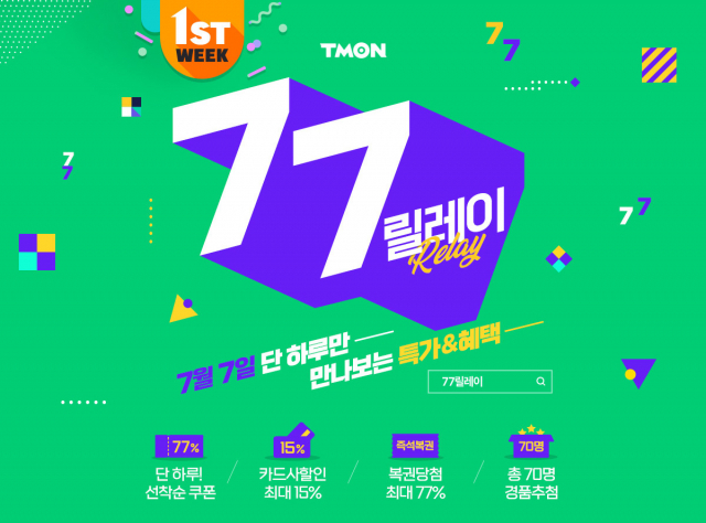 티몬이 7월 7일을 맞아 이날 하루 '77릴레이' 행사(사진)를 진행하면서 특가 상품은 물론 최대 77% 할인 쿠폰 지급, 경품 증정 등 숫자 7을 테마로 한 다양한 혜택을 준비했다고 이날 밝혔다. 먼저 시간대 별로 할인 쿠폰을 선착순으로 발급한다. 7일 오전 0시, 9시, 11시, 오후 1시, 3시, 5시에 14% 할인 쿠폰이 각각 777장씩, 그리고 77릴레이 테마에 맞게 오전 7시와 오후 7시에는 77% 특별 할인 쿠폰이 각각 77장씩 발급된다. '행운의 즉석복권 이벤트'를 통해 최대 77% 할인쿠폰의 행운도 노려볼 수 있다. 이 쿠폰은 ID당 1회 도전할 수 있으며 당첨 즉시 당일 사용이 가능하다.