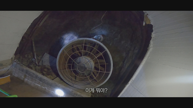 중앙 통로 끝은 또 다른 모습입니다. 처음 들어온 동굴처럼 옛 바위가 그대로 노출돼 있습니다. 정체불명의 초대형 환풍기도 비스듬히 중앙에 놓였습니다. 그 앞에는 작은 구덩이에 빗물이 고였습니다.