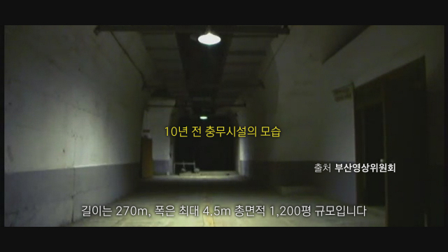 부산영상위원회 도움으로 10년 전인 2011년 때 충무시설 모습도 엿볼 수 있었습니다. 지금과 달리 거대한 출입문에는 국방 무늬가 입혀졌고, 바닥은 왕복 2차로 선이 그였습니다. 내부 천장 조명도 켜졌습니다. 부산영상위원회 관계자는 “방마다 나무로 된 문들이 달렸고, '경찰서장실' 같은 문패도 있었다”고 합니다.