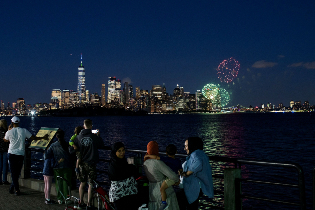 미국 뉴욕주의 성인 70%가 최소 한 차례 코로나19 백신을 맞은 것을 기념해 지난달 15일(현지시간) 뉴욕항 상공에서 불꽃놀이가 펼쳐지고 있다. 로이터·연합뉴스