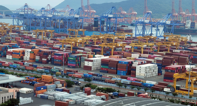 부산항 신항 부두 장치장에 컨테이너가 가득 쌓여 있다. 부산일보DB