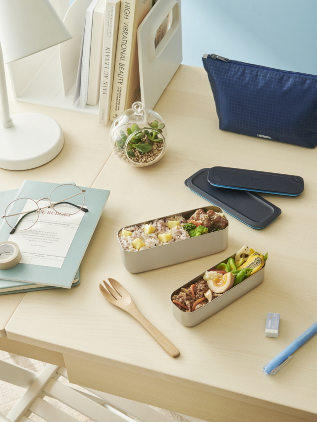 슬림2단 스테인리스 런치박스는 가방에 쏙 들어갈 수 있는 슬림한 6cm 폭과 2단 구성으로 휴대성을 높인 제품이다. 네이비체크(635mL), 블랙보더(815mL) 두 가지 종류로, 식사량에 맞춰 용량을 선택할 수 있도록 선택지를 넓혔다. 본체가 스테인리스 재질로 제작돼 음식의 양념이 물들거나 냄새가 잘 배지 않고, 쉽게 녹슬지 않아 내구성이 뛰어나다. 식기세척기 사용이 가능해 세척 또한 용이하다.